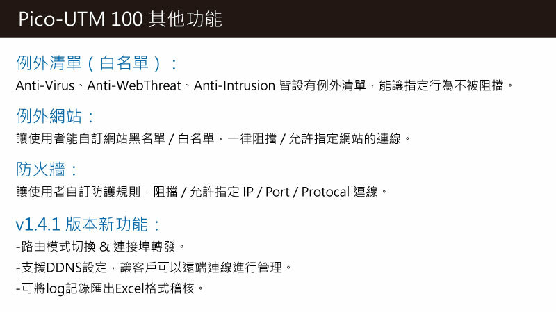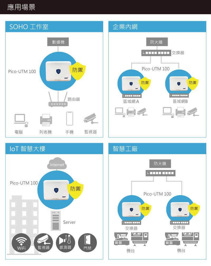 本產品可以防止包括殭屍網路攻擊,分散式阻斷服務(DDoS)攻擊,勒索病毒,弱密碼,加密,未修補的漏洞和訊息調查……等常見的網路攻擊。