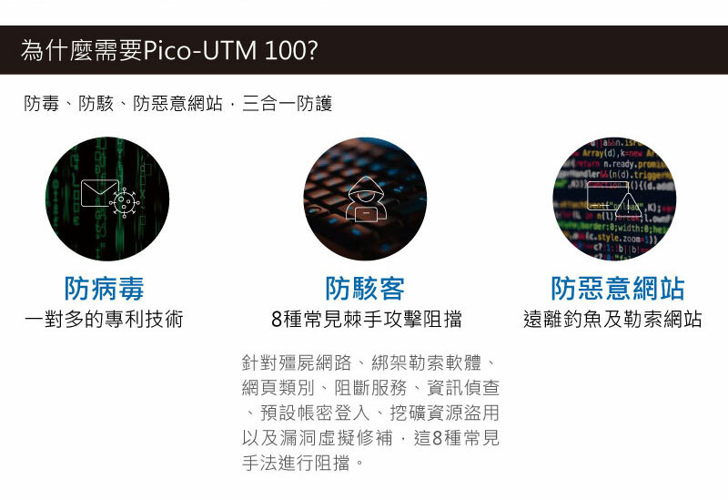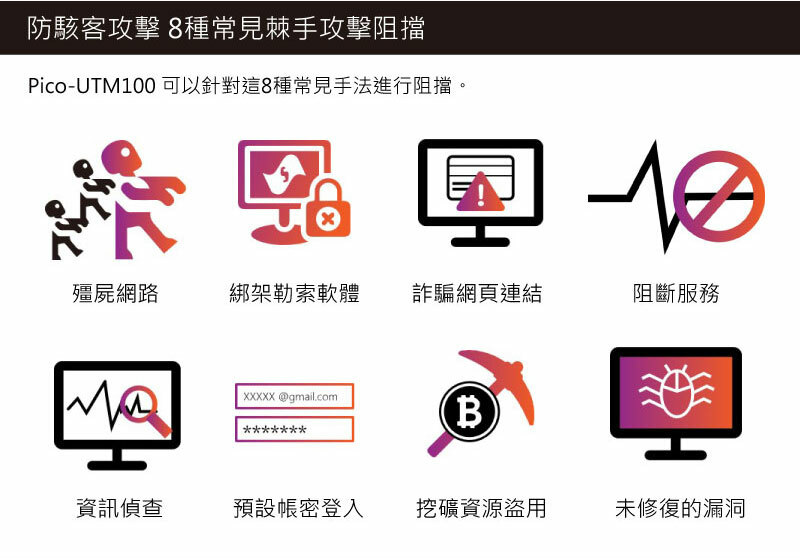 本產品可以防止包括殭屍網路攻擊,分散式阻斷服務(DDoS)攻擊,勒索病毒,弱密碼,加密,未修補的漏洞和訊息調查……等常見的網路攻擊。