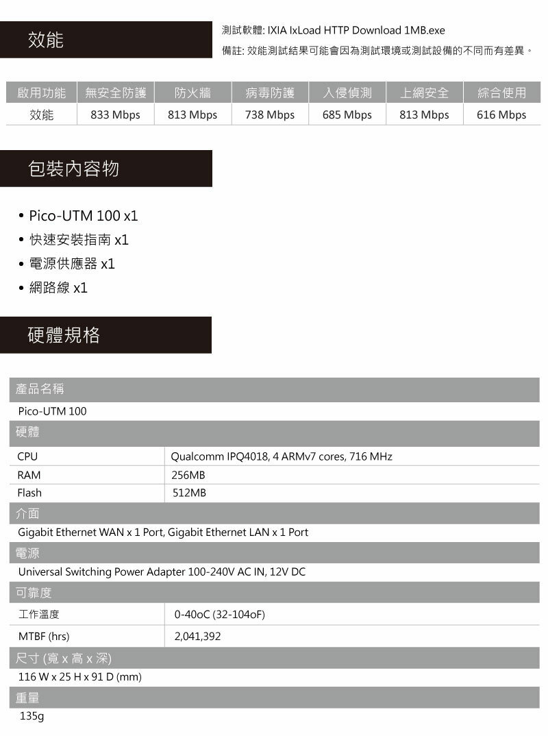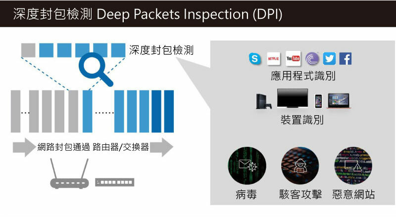 這是一種電腦網路封包過濾技術,用來檢查通過檢測點封包的資料部分,以搜尋不符合規範的協定、病毒、垃圾郵件、入侵,或以預定準則來決定封包是否可通過或需被路由至其他不同目的地,Pico-UTM 100可以根據內容,決定如何處理這些封包。