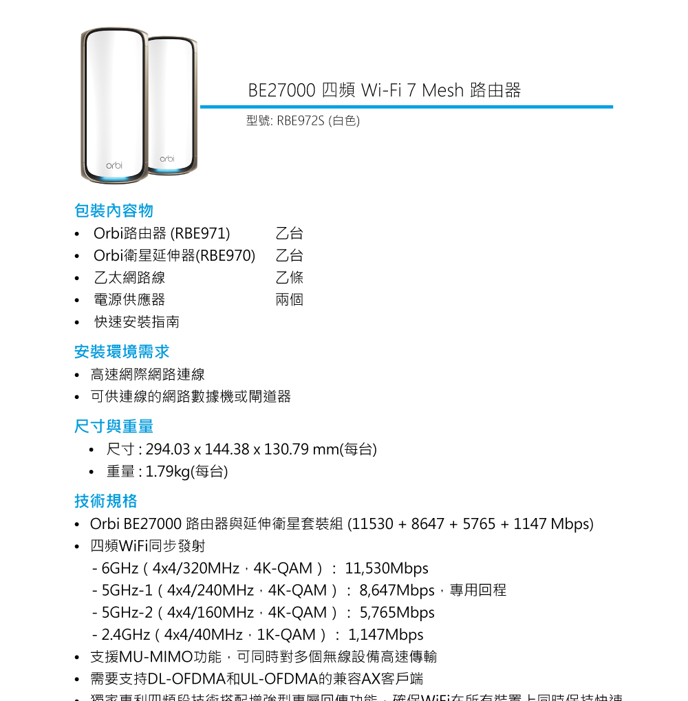 [ NETGEAR 員購專區 ] NETGEAR Orbi RBE972S BE27000 四頻 WiFi 7 Mesh 路由器 (星盾白)